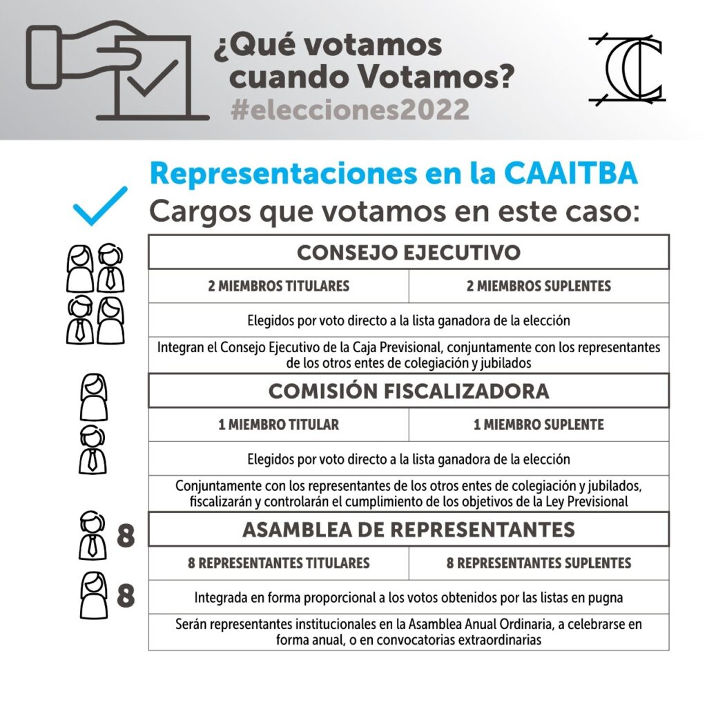 La elección involucra la constitución de la Mesa Ejecutiva y Tribunal de Disciplina del CS; Representación en el Consejo Ejecutivo, Comisión Fiscalizadora y Asamblea de representantes de la CAAITBA; Consejos Directivos Distritales, Delegación al CS y cuerpo de Jurados y Asesores, con mandato por un periodo de (3) tres años.