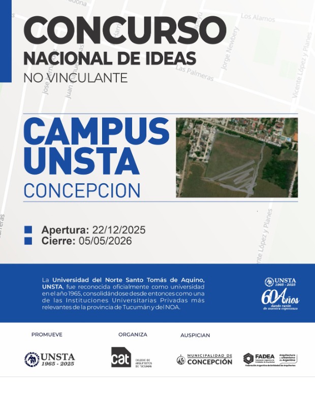 Organizado por el Colegio de Arquitectos de Tucumán, junto a la Universidad Nacional Santo Tomás de Aquino –UNSTA-, con el auspicio de FADEA y la Municipalidad de Concepción, el Concurso busca ideas para el desarrollo de un campus universitario propio en un predio en la ciudad de Concepción.