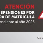 Recordamos a los colegas que por resolución del Consejo Superior del CAPBA, está vigente el régimen de pago anual de la matricula -no fraccionado en trimestres como antiguamente-, y que el mecanismo de suspensión por deuda de la misma se opera automáticamente al 31 de marzo de cada año, en caso que el profesional adeude la matrícula del período anterior (en la actualidad, deuda del año 2025).